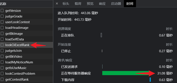对于一场竞赛排名的请求,从发起请求开始计时到获取到结果停止计时,一次请求后端逻辑运算花费 31.08 毫秒,数据下载花费 0.63 毫秒,一共耗时 32.75 毫秒,分析得出后端处理速度极快,响应速度极快的结果。